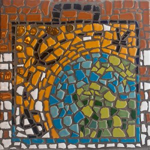 De mozaïek bevat geld, koffers, de wereld… Kortweg de attributen van een (handels)reiziger.